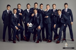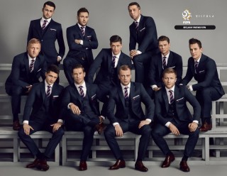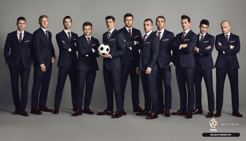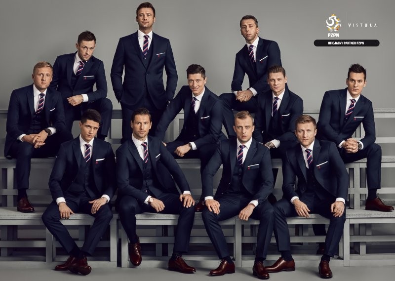 Garnitury dla piłkarzy, trenera drużyny oraz managementu powstały w ścisłej współpracy projektanta Vistuli z Polskim Związkiem Piłki Nożnej. Efektem są głęboko granatowe, trzyczęściowe garnitury z wysokiej jakości wełny, pochodzącej od włoskiego producenta Tallia Di Delfino. Zapinana na dwa guziki, mocno taliowana marynarka posiada nowoczesne klapy w szpic, a z jej kieszonki wystaje elegancko złożona, biała jedwabna poszetka. Do tego jednorzędowa kamizelka, proste spodnie w kant, biała lub błękitna koszula z włoskim kołnierzykiem i jedwabny granatowy krawat w biało- czerwone paski nawiązujące do polskiej flagi. Całość stylizacji uzupełniają brązowe buty i skórzany pasek. Wynik? Drużyna skrojona na miarę.