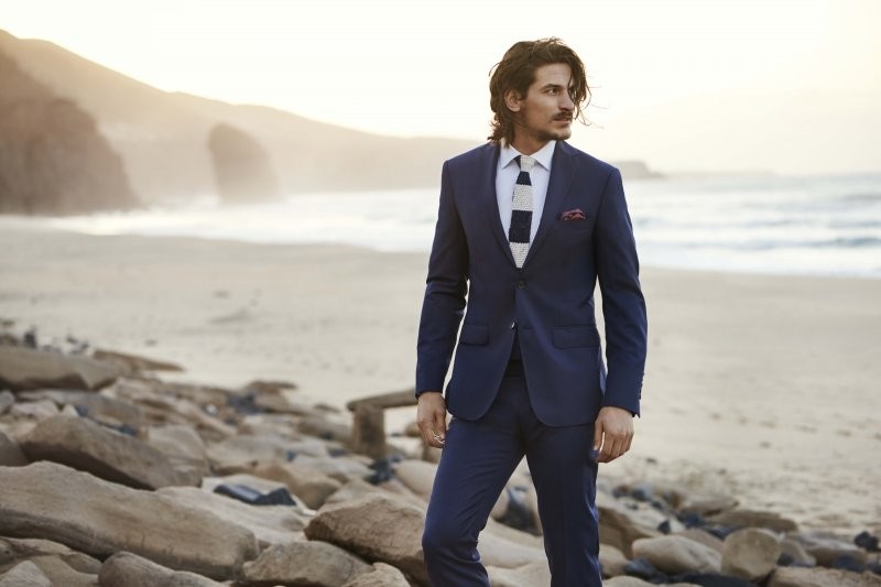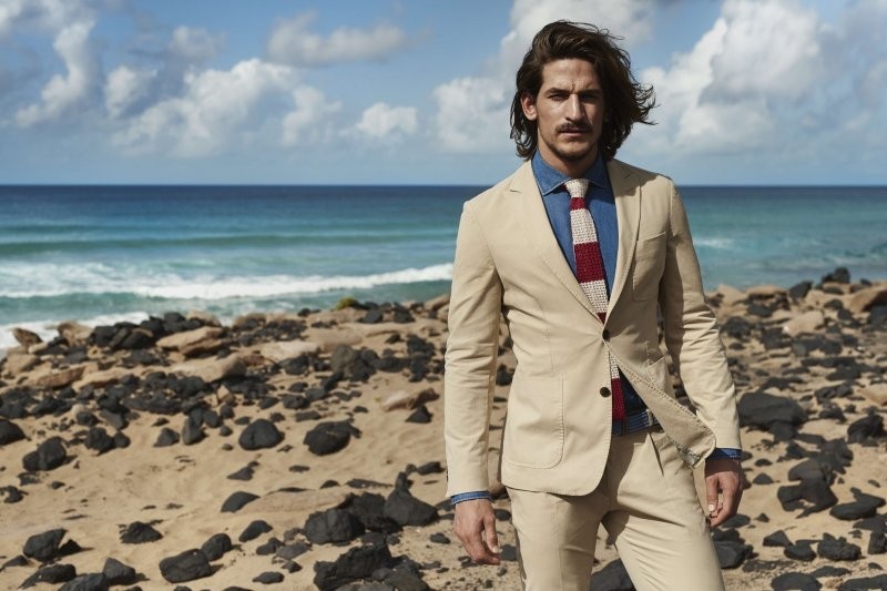 W myśl obowiązującego obecnie w modzie męskiej kanonu, fasony są proste i dopasowane do sylwetki. Obok klasycznych garniturów o smuklejszym kroju, znajdziemy mniej formalne beżowe modele z bawełnianej pimy, znakomite w roli szykownej wielkomiejskiej stylizacji oraz granatowe garnitury w niezobowiązujący, drobny biało-czerwony wzór, dodający klasycznemu wizerunkowi letniego luzu.
