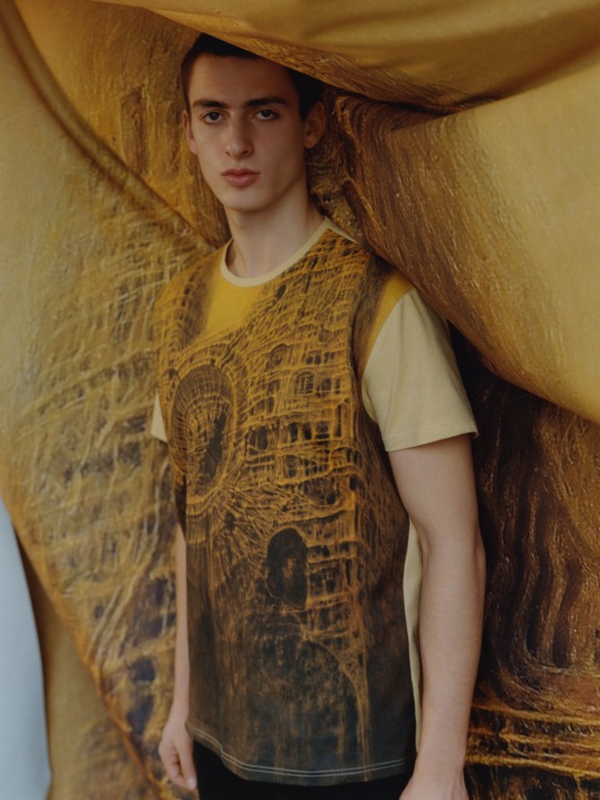 The collection inspired by the dreamlike and surreal world known from Beksiński's paintings is a series of products presenting the artist's selected works. The reproductions of the paintings were directly transferred onto t-shirts, sweatshirts and jackets in the form of a large, uniform print, as well as cut, resized elements of the works. Both the materials used in the making of the collection and the innovative approach to form give the entire line of clothes a unique character. The shape of the sweatshirts has been widened, thus obtaining the oversize style with a lowered shoulder line at the same time. A similar procedure was used in the case of t-shirts. Moreover, some of them were sewn from the materials used in the production of said sweatshirts. The collection also includes: a bomber jacket with a large image reprint and a cotton jacket, which is a perfect representation of the one the artist used to wear on a daily basis. This model hides an image inside the garment. The colors of the entire collection are limited to black, navy blue and shades of camel, which directly relates to the color palette used by Beksiński.