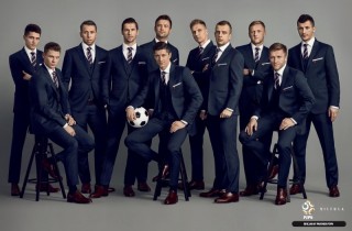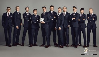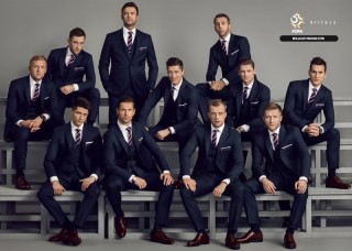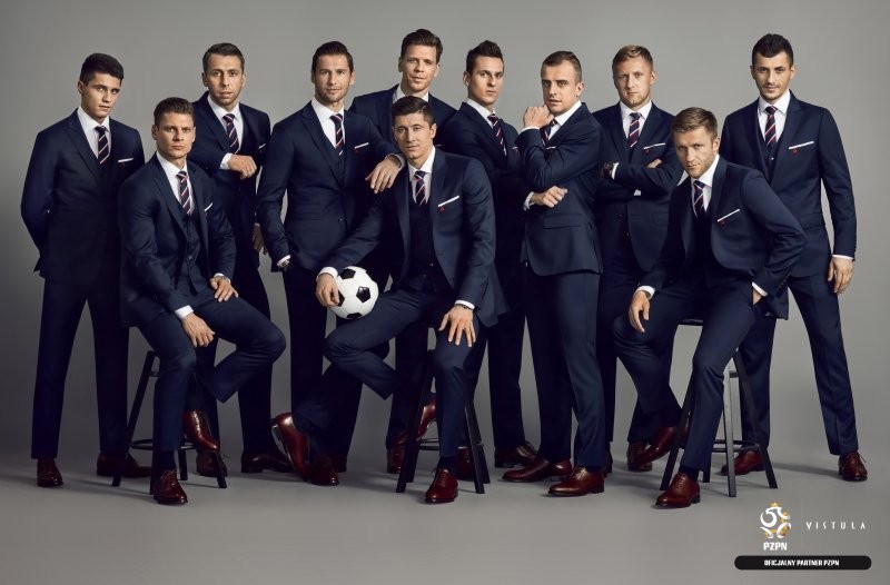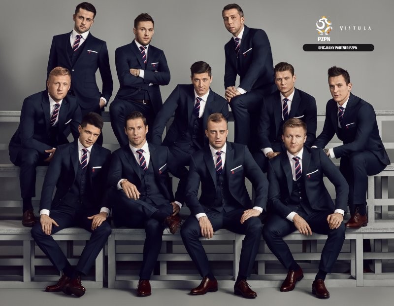 Garnitury dla piłkarzy, trenera drużyny oraz managementu powstały w ścisłej współpracy projektanta Vistuli z Polskim Związkiem Piłki Nożnej. Efektem są głęboko granatowe, trzyczęściowe garnitury z wysokiej jakości wełny, pochodzącej od włoskiego producenta Tallia Di Delfino. Zapinana na dwa guziki, mocno taliowana marynarka posiada nowoczesne klapy w szpic, a z jej kieszonki wystaje elegancko złożona, biała jedwabna poszetka. Do tego jednorzędowa kamizelka, proste spodnie w kant, biała lub błękitna koszula z włoskim kołnierzykiem i jedwabny granatowy krawat w biało- czerwone paski nawiązujące do polskiej flagi. Całość stylizacji uzupełniają brązowe buty i skórzany pasek. Wynik? Drużyna skrojona na miarę.